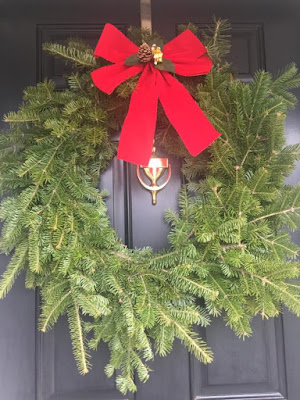 I like to decorate for Christmas the weekend right after Thanksgiving, but that didn't happen last year because we went to the Cape, so the Christmas decorations didn't come out until the first weekend of December. I did however end November with this festive evergreen wreath on the door, thanks to a cute Cub Scout who came selling them door-to-door.