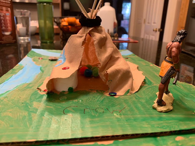 One of them was about the Native Americans (or Indians, which I don't feel bad calling them because a historian I know who works with them said that in his experience, many of them prefer being called that). Sam had to make an Indian habitat for school, and he chose to make a teepee. He did it pretty much on his own, and I thought he did a great job with it. He said that some of the other kids had way fancier ones, and it inspired him to make a longhouse for fun soon after this (pictures to come next month when I do my November posts--because I'm finally just about caught up!!!).