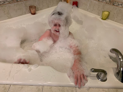 Like his mother, Sam enjoys jacuzzi bubble baths. (But unlike his mother, he likes to go underwater and get his head wet!) He was trying to hide his whole body under the bubbles except for his arm standing up. Kind of like a bubble bath avalanche. 😆