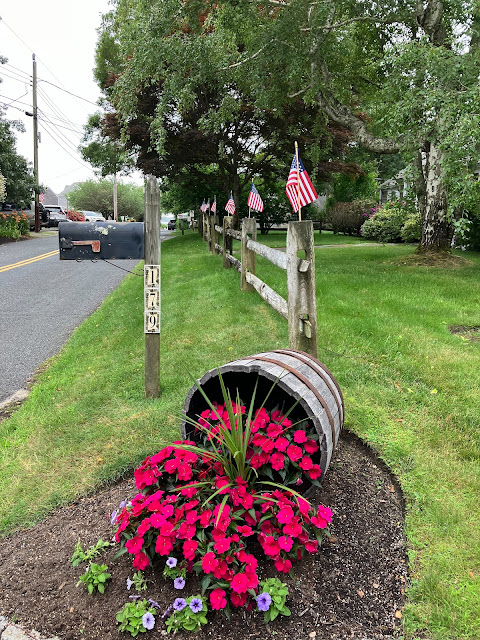 I walked down to the beach and on my walk there and back, there were so many pretty scenes of flags and hydrangeas in full bloom. I was in heaven! I love where my house is on the Cape!